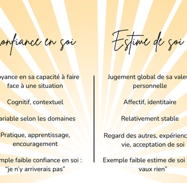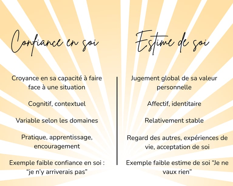 La confiance en soi, quant à elle, correspond à la croyance en sa capacité à accomplir une tâche ou à faire face à une situation spécifique (Bandura, 1997).